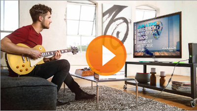 The Rocksmith system is designed for teaching guitar. We also incorporate amplifiers, microphones, stage lighting, keyboards, drums... It's like band karaoke with real instruments!